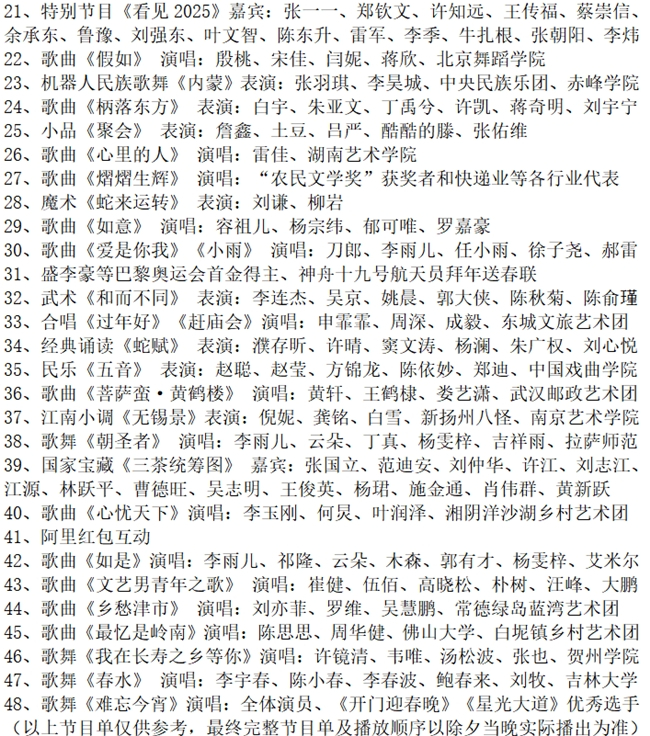 (以上节目单仅供参考,最终完整节目单及播放顺序以除夕当晚实际播出为准)