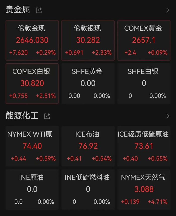 此外,欧股涨幅亦持续扩大,欧洲斯托克50指数涨近2%,法国CAC40指数涨超2%,德国DAX指数涨1.3%。现货白银2.33%,COMEX白银上涨2.51%。波罗的海干散货指数跌2.71%,至1043点。