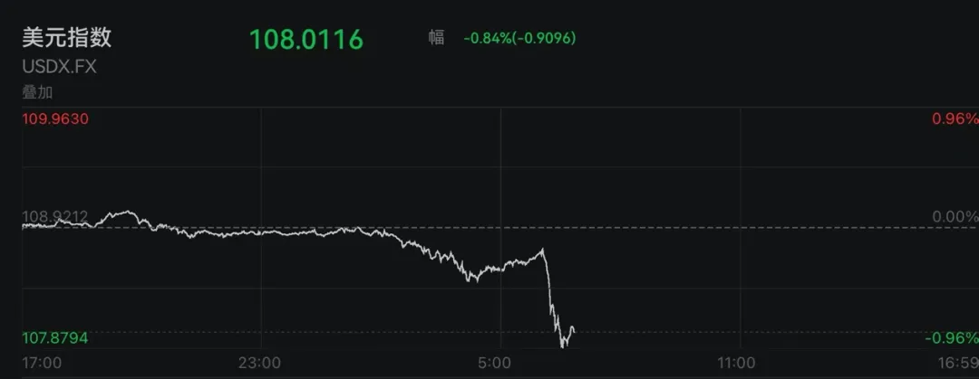 美元指数短线跳水,日内跌超0.8%,现报108.01。