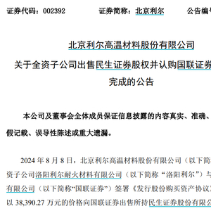 北京利尔曾表示,目前证券行业的整合正在加速,公司看好国联证券与民生证券重组后的协同效应,本次交易中洛阳利尔通过出售民生证券股份以获得国联证券发行的A股股份作为交易对价并实现了投资退出,未来随着国联证券通过本次交易及后续整合实现的价值提升,公司有望持续受益。