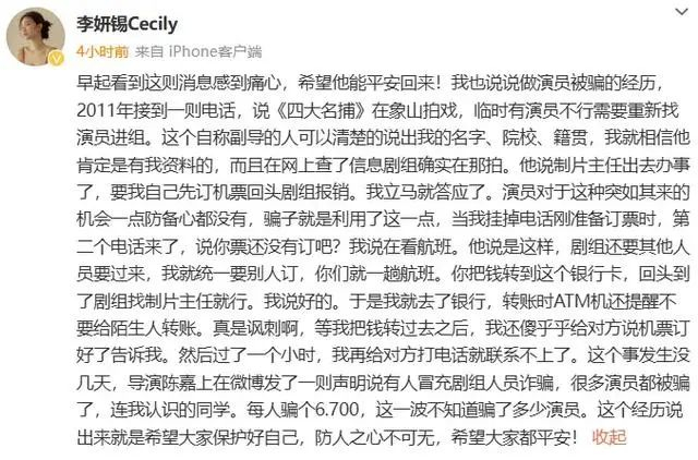 演员 @李妍锡Cecily 发文称看到#多位明星转发演员星星失联消息#,分享自己被骗的经历:2011年接到电话,自称副导的人说需要重新找演员进组,让我先订机票回头剧组报销。后又打电话说让我把钱转到银行卡,到了剧组找制片主任。我转账后再给对方打电话就联系不上了。