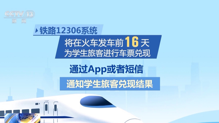 铁路12306系统将在火车发车前16天为学生旅客进行车票兑现,并通过App通知或者短信通知学生旅客兑现结果。车票兑现成功后,学生旅客需在当日23时前,在铁路12306App中完成预约购票订单支付。