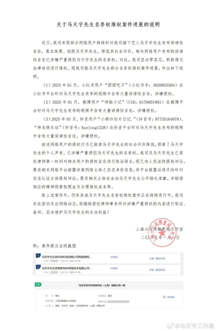 1月6日,马天宇工作室在社交网站发布《关于马天宇先生名誉权维权案件进展的说明》。