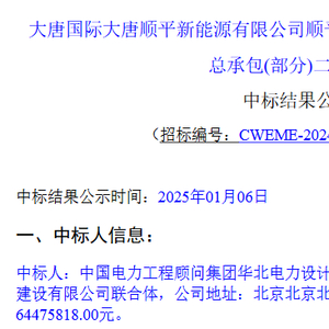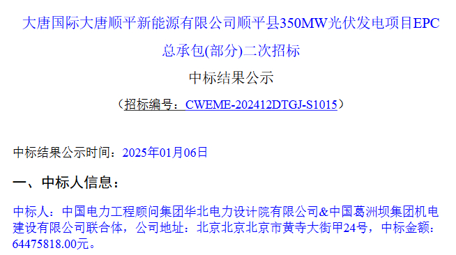 大唐国际大唐顺平新能源有限公司顺平县350MW光伏发电项目EPC总承包(部分)二次招标中标结果公示,中国电力工程顾问集团华北电力设计院有限公司&中国葛洲坝集团机电建设有限公司联合体中标,中标金额:6447.5818万元,折算单价约为:1.08元/W.