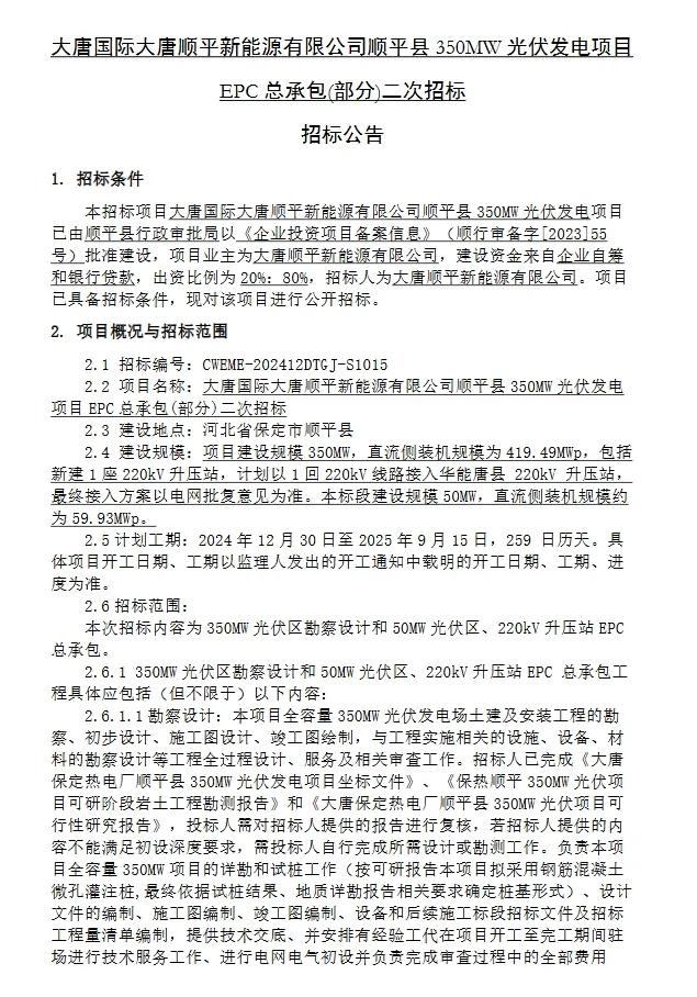 1.08元/W!大唐350MW光伏发电项目EPC(部分)中标结果公示!