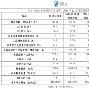 首席经济学家们对2024年12月CPI同比增速的预测均值为0.2%,PPI同比预测均值为-2.36%。去年12月工业增加值增速预测均值为5.35%,固定资产投资累计增速预测均值为3.31%,社会消费品零售总额同比增速预测均值为3.54%。去年12月份贸易顺差预测均值为969.41亿美元。