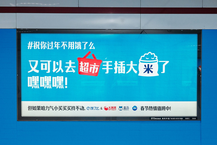 饿了么是天与空长期服务的客户,我们为饿了么产出过无数优秀案例,今年年初,看到别家Agency为饿了么做的#祝你过年不用饿了么#的营销策划,感觉眼前一亮,非常喜欢。首先是反套路的创意,永远会吸引眼球,饿了么竟然#祝你过年不用饿了么#,品牌有格局,创意有胆识,文案有洞察,反向营销,反而提升了饿了么的品牌好感度。此外,这波创意是文案制胜,我是一个文案出身的创意人,对有洞察的文案型的创意本来就很喜欢。再者,这一系列的地铁海报,甚至都没有什么画面,只有文字的排版,吃惯了大鱼大肉(视觉奇观),突然吃点白菜豆腐(素雅文案),感觉挺好。消费下行和预算缩减的这两年,低成本就做不好广告了吗?这一系列海报,制作成本几乎为零,这说明,预算高与低,不会限制有话题的好创意的诞生。