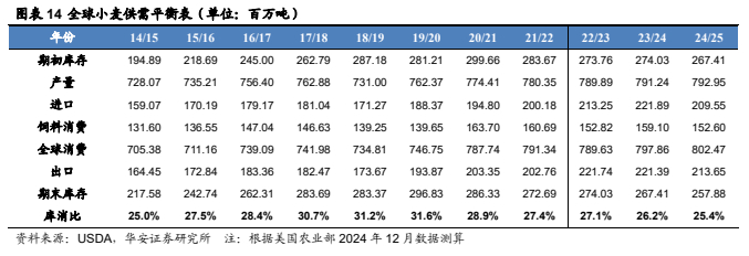 美国农业部 2024 年 12 月预测:2024/25 年,全球小麦产量 7.93 亿吨,较 23/24 年增加 171 万吨,预测值环比减少 178 万吨;全球小麦消费量 8.02 亿吨,较 23/24 年度增加 461 万吨,预测值环比减少94 万吨;全球小麦期末库存 2.58 亿吨,较 23/24 年度减少 953 万吨,预测值环比增加 31 万吨;库消比 25.4%,较 23/24 年度下降0.86 个百分点,预测值环比上升 0.08 个百分点,处于 15/16 年以来最低水平。贸易方面,2024/25 年,全球小麦出口量 2.14 亿吨,较23/24 年减少 774 万吨,预测值环比减少 102 万吨。