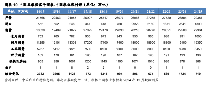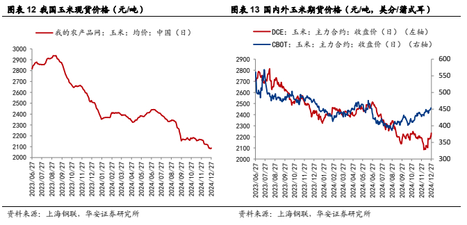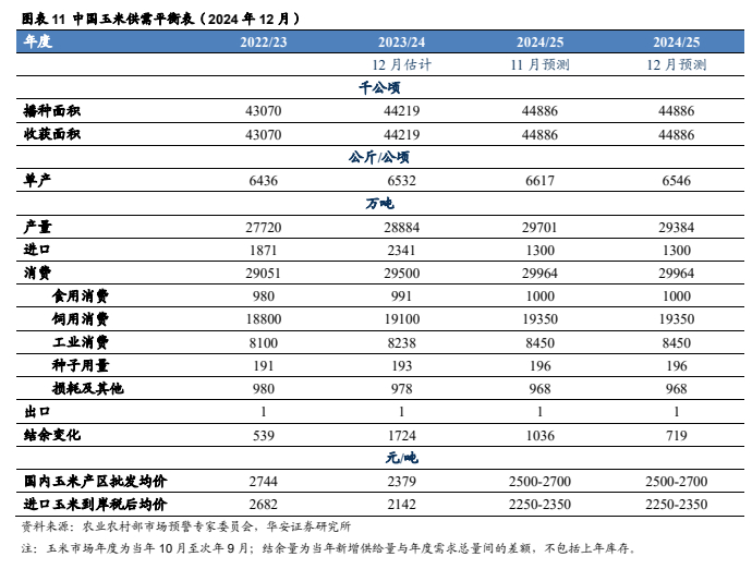 中国农业农村部 2024 年 12 月预测:2023/24 年预测数据与 11 月预测值持平,2024/25 年,国内玉米单产下调 71kg/公顷至 6,546kg/公顷,国内玉米产量 2.94 亿吨,进口 1,300 万吨,国内消费量 3.0 亿吨,其中,食用消费 1,000 万吨,饲用消费1.94 亿吨,工业消费 8,450 万吨,种子用量 196 万吨,年度结余量 719 万吨。2024年我国玉米市场供应宽松,国内玉米现期货整体呈现下跌趋势,我们判断,低位风险已经释放,国内玉米价格继续下跌空间有限,我们需要关注新季玉米大量上市以及进口量增加等因素。