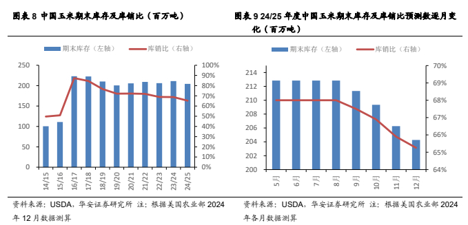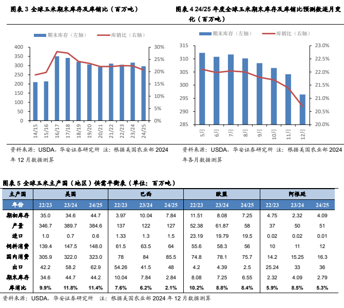 从需求角度看,2024/25 年,全球玉米消费量 12.38 亿吨,较 23/24 年增加 1,959万吨,预测值环比增加 818 万吨;全球玉米期末库存 2.96 亿吨,较 23/24 年减少1,978 万吨,预测值环比减少 770 万吨,主要原因是中国和美国玉米期末库存减少;库消比 20.7%,较 23/24 年度下降 1.69 个百分点,预测值环比下降 0.71 个百分点,处于 16/17 年以来最低水平。