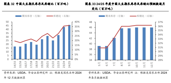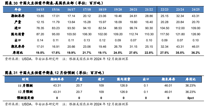 美国农业部 2024 年 12 月预测:2024/25 年,中国大豆产量 2,070 万吨,较23/24 年度减少 14 万吨,预测值环比持平;进口量 1.09 亿吨,较 23/24 年度减少300 万吨,预测值环比持平;国内消费量 1.27 亿吨,较 23/24 年度增加 510 万吨,预测值环比持平;期末库存 4,601 万吨,较 23/24 年度增加 270 万吨,预测值环比持平;库消比 36.2%,较 23/24 年度上升 0.69 个百分点,预测值环比持平,处于00/01 年以来最高水平。