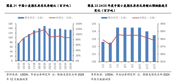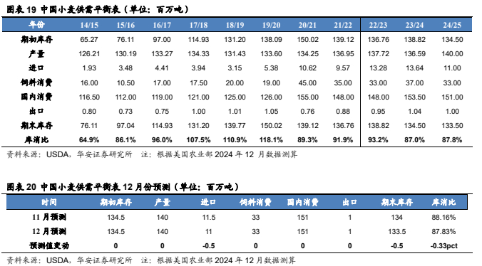 美国农业部 2024 年 12 月预测:2024/25 年,中国小麦产量 1.4 亿吨,较 23/24年度增加 341 万吨,预测值环比持平;进口量 1,100 万吨,较 23/24 年度减少 264万吨,预测值环比减少 50 万吨;国内消费量 1.51 亿吨,较 23/24 年度减少 250 万吨,预测值环比持平;期末库存 1.34 亿吨,较 23/24 年度减少 100 万吨,预测值环比减少 50 万吨;库消比 87.8%,较 23/24 年度上升 0.8 个百分点,预测值环比下降0.33 个百分点,处于 16/17 年以来底部区域。