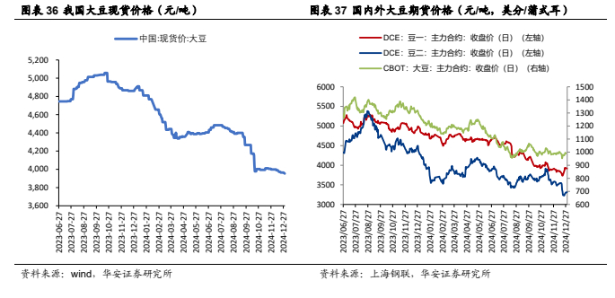 中国农业农村部 2024 年 12 月预测:2023/24 年,中国大豆进口量下调 245 万吨至 10,229 万吨,结余变化调整为 610 万吨,2024/25 年,国内大豆单产下调 28kg/公顷至 1,993kg/公顷,国内大豆产量上调 11 万吨至 2,065 万吨,进口 9,460 万吨,国内消费量 1.15 亿吨,其中,食用消费 1,560 万吨,压榨消费 9,490 万吨,种子用量 88 万吨,年度结余量为 51 万吨。国内大豆主产区收获接近尾声,新豆集中上市,市场供应充足,中储粮陆续开库收购,对大豆价格形成底部支撑,并提振市场信心。随着下游采购需求被带动,我们预计国产大豆价格将平稳运行。