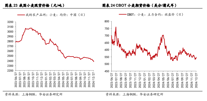 美国农业部 2024 年 12 月预测:2024/25 年,全球小麦产量 7.93 亿吨,较 23/24年增加 171 万吨,预测值环比减少 178 万吨,主要原因是巴西、欧盟产量下调。