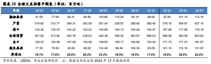 美国农业部 2024 年 12 月预测:2024/25 年,全球大豆产量 4.27 亿吨,较 23/24 年度增加 3,227 万吨,预测值环比增加 174 万吨;全球大豆消费量 4.04 亿吨,较 23/24 年度增加 1,965 万吨,预测值环比增加 136 万吨;全球大豆期末库存 1.32 亿吨,较 23/24 年度增加1,971 万吨,预测值环比增加 13 万吨;库消比 22.5%,较 23/24 年度上升 2.54 个百分点,预测值环比下降 0.04 个百分点,处于 19/20年以来最高水平。贸易方面,2024/25 年,全球大豆出口量 1.82 亿吨,较 23/24 年度增加 450 万吨,预测值环比增加 26 万吨。