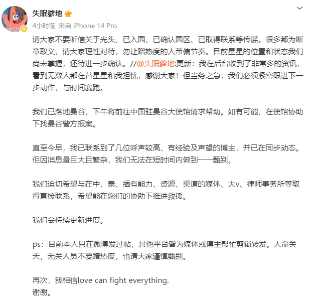 1月6日,其再发文称,“请大家不要听信关于光头、已入园、已确认园区、已取得联系等传谣。很多都为断章取义,请大家理性对待,勿让蹭热度的人带偏节奏。目前星星的位置和状态我们尚未掌握,还待进一步确认。”并表示已落地曼谷,下午将前往中国驻曼谷大使馆请求帮助。
