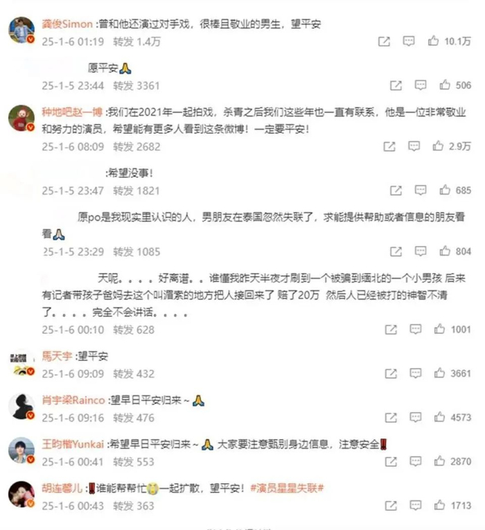 目前,已有多名演员在社交平台发声,希望王星能早日平安归来。演员龚俊转发相关微博表示,“曾和他还演过对手戏,很棒且敬业的男生,望平安。”曾参演真人秀节目《种地吧》的演员赵一博表示,“我们在2021年一起拍戏,杀青之后我们这些年也一直有联系,他是一位非常敬业和努力的演员,希望能有更多人看到这条微博!一定要平安!”马天宇、曾参演电视剧《人世间》的演员胡连馨和演员肖宇梁也发声,希望王星能平安。