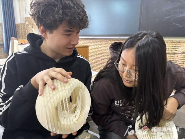 乌鲁木齐职业大学中等职业教育学院学生比拉里·麦麦提(左)和刘千瑜(右)正在商量下一阶段纸雕产品的新创意。石榴云/新疆日报记者 王晶晶摄