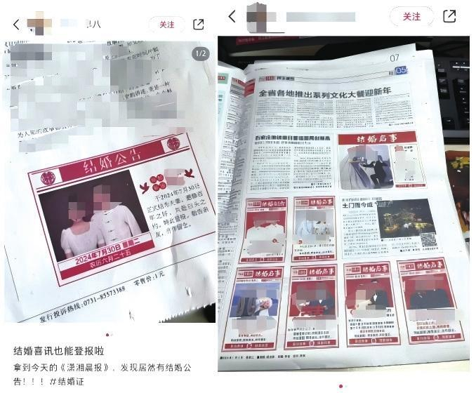 杨女士和丈夫同岁,两人2023年7月结为夫妻。他们的结婚启事在2023年8月17日登上了沈阳一家报纸的版面。杨女士说,她曾在网上看到有人结婚登报,觉得很有意思,于是决定自己结婚时也要用这种方式留下纪念。“网络上的信息随时可以删除、修改,而出版物一旦发行就不可更改、撤销,因此我觉得登报结婚是一种很浪漫的纪念方式。”