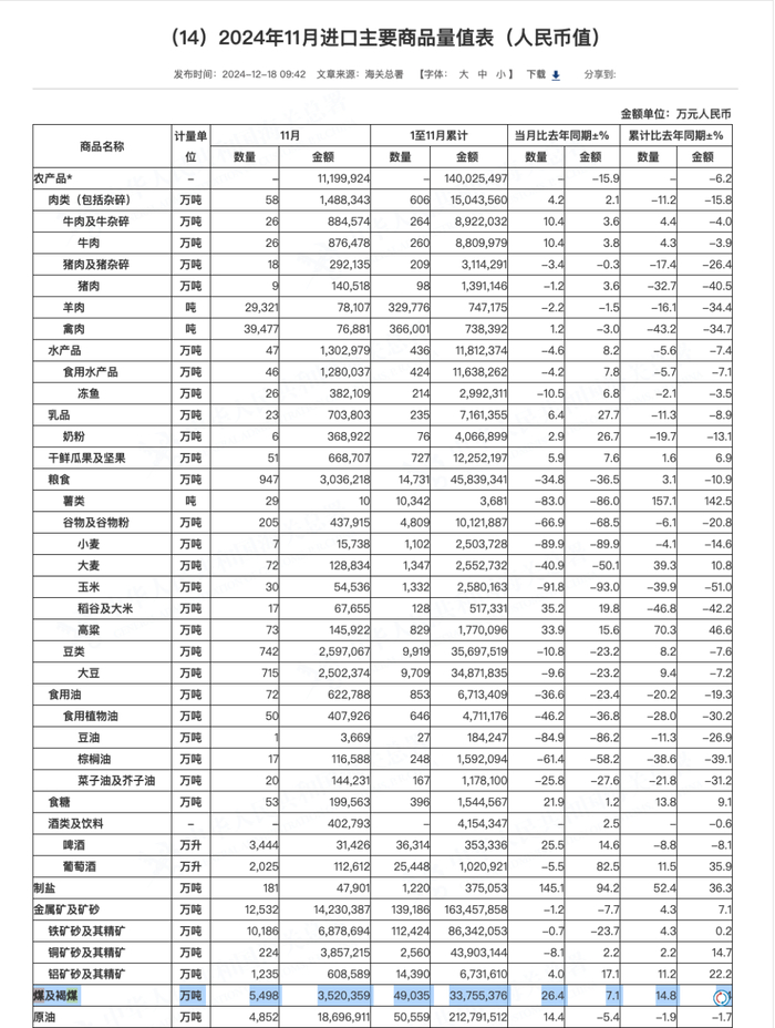 2024年12月10日海关总署公布数据,11月,中国煤及褐煤进口量达到5498.2万吨,同比增长26.4%,创单月历史最高水平。