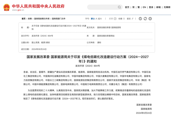 2024年6月24日,发改委、能源局两部门联合发布《煤电低碳化改造建设行动方案(2024—2027年)》,提出了三年煤电低碳化目标。
