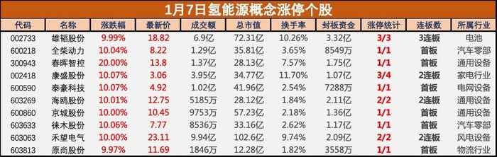 1月7日,氢能源概念股掀涨停潮,截至发稿,雄韬股份3连板,禾望电气2连板,春晖智控20CM封板,海鸥股份、禾望电气多股涨停。涨停个股中,雄韬股份和京城股份两家公司值得关注。