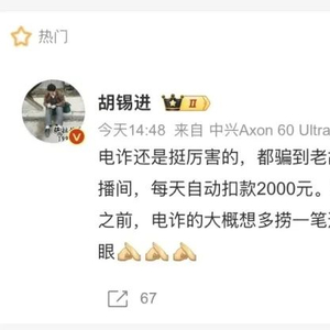 胡锡进还在微博中提醒说,春节之前,电诈的大概想多捞一笔过个肥年。大家凡接到陌生信息涉及钱的,都多存一个心眼。