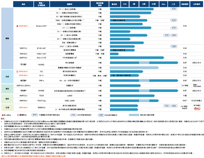迈威生物的管线专注于创新药,同时维持与已建立机制之间的平衡。创新药方面:公司实施采用新路径及先发优势打造差异化药物的策略。ADC是公司管线的关键组成部分。除核心产品9MW2821之外,公司还正在推进针对其他靶点的其他具竞争优势的ADC候选药物,包括7MW3711(一种靶向B7-H3 ADC)、7MW4911(一种靶向CDH17 ADC)。除ADC外,公司已建立丰富且具竞争力的产品管线,包括单克隆抗体、融合蛋白、小分子药物等模态药物,包括9MW1911(中国首个获批进行临床开发靶向ST2的自主开发候选药物)、重组人源化靶向TMPRSS6单克隆抗体9MW3011(全球开发状态领先的靶向TMPRSS6治疗药物)。