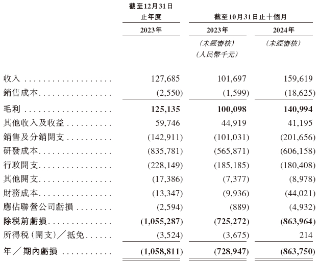 招股书显示,在过去的2023年和2024年前十个月,迈威生物的营业收入分别为人民币1.28亿和1.60亿元,相应的研发开支为人民币8.36亿和6.06亿元,相应的净亏损分别为人民币10.59亿和8.64亿元。