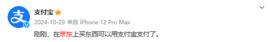值得注意的是,支付宝官方微博于2024年10月29日宣布,“在京东上买东西可以用支付宝支付了。” 当时有媒体就接入一事采访京东客服,得到的答复与上述回应一致。