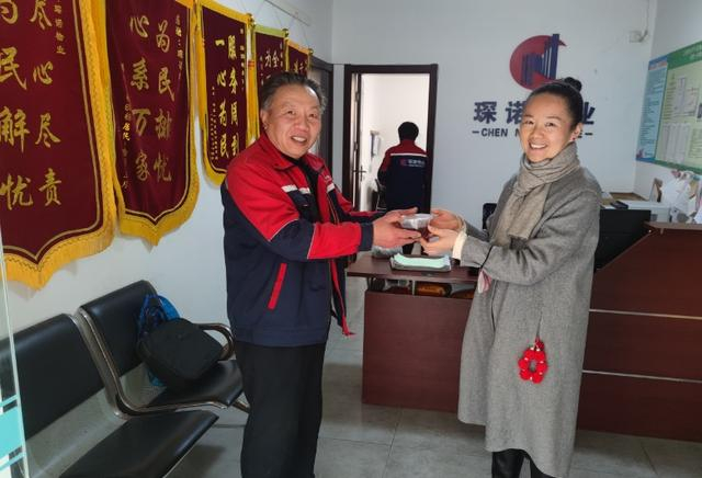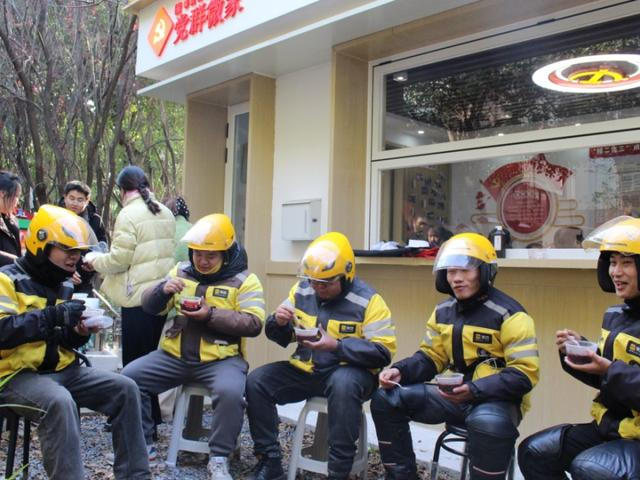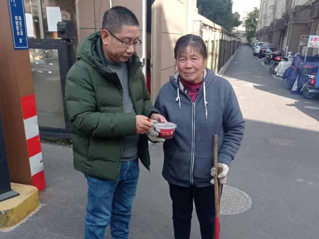 居委工作人员将粥送到了物业一线工作人员、志愿者、商户们还有外卖骑手们的手中,给他们送去冬日里的暖意。