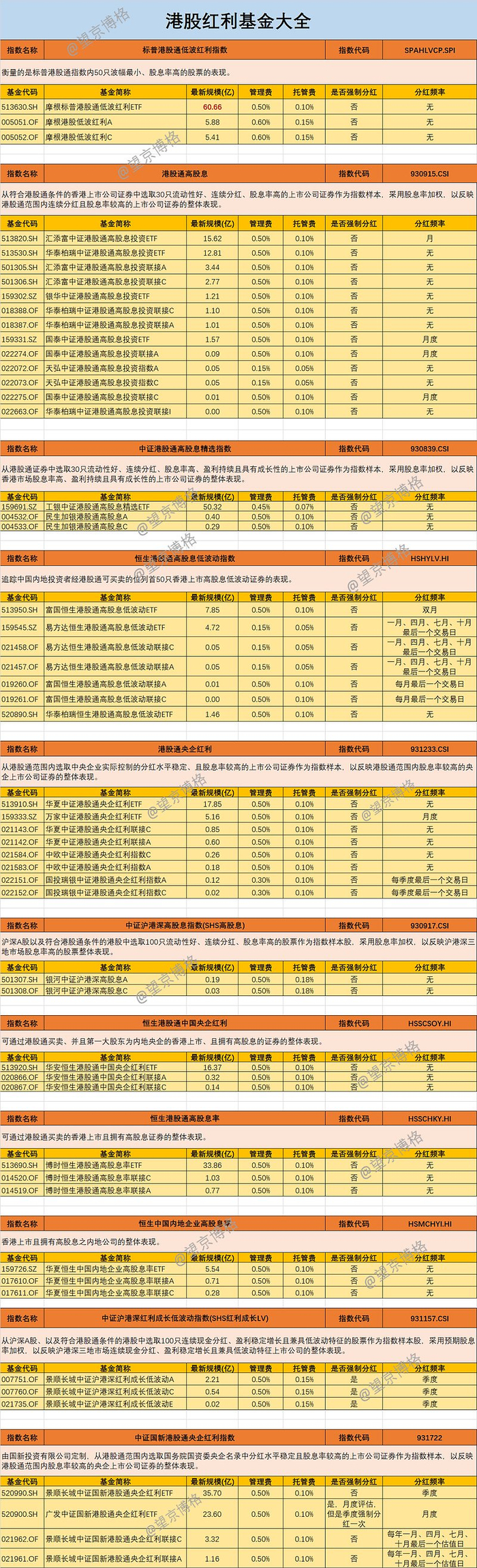 目前长期国债收益太低了,博格觉得港股红利或将成为2025年的投资主线之一,现在把港股红利基金的费率、分红条款与规模整理一下: