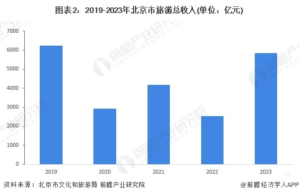 从旅游总收入看,2019年,北京市年旅游总收入在6000亿元以上,2020年大幅下降,仅为2914亿元。2023年,北京市旅游行业回暖后,旅游总收入有较大提升,达到5850亿元,同比增长132%。