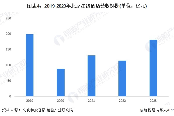 2019年北京市星级酒店营收规模接近200亿元,2020年受疫情影响跌至90亿元。2023年随着北京市旅游行业的回暖,星级酒店营业收入也大幅回升,超过180亿元。