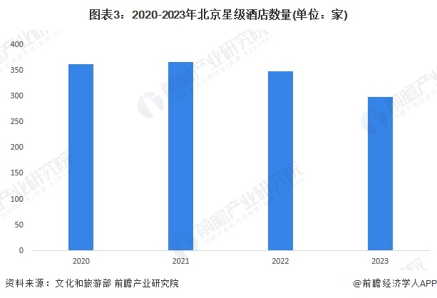 2020年和2021年北京市星级酒店数量均在360家以上,2022年,北京市星级酒店数量下降至349家,2023年星级饭店数量仅剩299家。