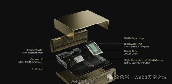 它基于我们研发的超级秘密芯片GB110,这是我们生产的最小型的Grace Blackwell芯片。这是其内部结构,它目前正在量产中。这款绝密芯片是我们在与联发科合作中研发的Gray CPU,专为英伟达打造,并与全球领先的SoC公司联发科合作完成。他们与我们共同开发了这款CPU SoC,并通过芯片到芯片的NVLink连接到Blackwell GPU。