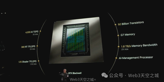 这就是人工智能令人难以置信的能力之一,它正在彻底改变GeForce。今天,我们宣布推出下一代产品——RTX Blackwell系列。这是我们全新的GeForce RTX 50系列Blackwell架构,这款GPU拥有920亿个晶体管,4000个顶点着色器,四千万亿次人工智能浮点运算(比上一代AIDA高出三倍),以及380万亿次光线追踪浮点运算,还有125个着色器TFlops,以及性能相同的整数单元,两个双着色器(一个用于浮点运算,一个用于整数运算),来自美光的G7内存,带宽达1.8TB/s,是上一代产品的两倍。
