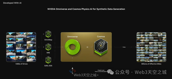 我们将数千次驾驶数据转化为数十亿英里,拥有大量的自动驾驶车辆训练数据,当然,这需要持续的实际道路测试和数据收集。利用基于物理的多宇宙能力生成合成数据,确保训练AI的数据具有物理基础、准确且合理,从而获得海量训练数据。