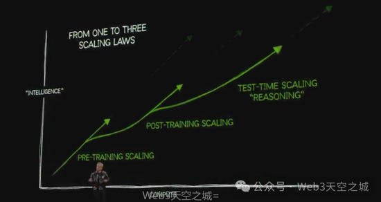 我们现在有了第三个规模法则,它与测试时缩放有关。测试时缩放是指AI在使用过程中,能够灵活分配计算资源,不再仅仅改进参数,而是专注于决定使用多少计算资源来生成答案。推理和长期思考是两种实现方式,AI系统可能将问题分解成多个步骤,产生多个想法并进行评估,最终选择最佳方案。测试时缩放已被证明极其有效。