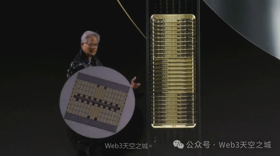 现在,所有这一切的目标就是为了创造一个巨大的芯片。我们需要的计算量确实非常惊人。这基本上就是一个巨大的芯片。如果我们不得不去制造一个芯片……对不起,各位。你们看到了吗?太酷了。看看这个,这里有迪斯科灯。如果我们必须把它做成一个芯片,很显然,它会有晶圆那么大,但这还不包括良率的影响,它可能需要三到四倍那么大。但我们这里基本上有72个Blackwell GPU或144个芯片。这个芯片的算力是1.4exaflops。世界上最大、最快的超级计算机,直到最近才……整个房间的这台超级计算机直到最近才达到1艾弗洛普以上。这是1.4exa flops的AI浮点运算性能。