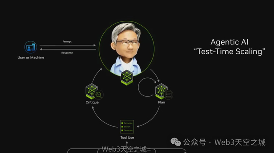 在企业领域,自主式人工智能是最重要的发展之一。自主式人工智能是测试时扩展的完美例子。它是一个模型系统,一部分是理解和与客户/用户互动,一部分可能是检索信息,像抹布一样的语义AI系统。它可能访问互联网,学习PDF文件,使用工具、计算器,或使用生成式AI生成图表等。它会迭代,将问题分解成一步步的步骤,并迭代所有不同的模型。过去,你提出问题,答案就会涌现出来。未来,你提出问题,后台将有一大堆模型在工作。因此,推理所需的计算量将急剧增加,因为我们追求越来越好的答案。