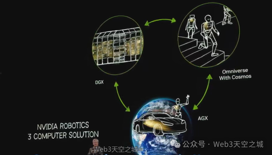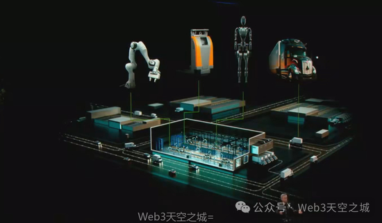 连接两者需要一个数字孪生,它正是所有模拟的基础。数字孪生是训练好的AI进行实践、改进、合成数据生成、强化学习和AI反馈等操作的场所,因此它是AI的数字孪生。这三台计算机将交互式工作,这套三机系统正是英伟达针对工业世界的战略,我们已讨论多时。与其说是“三体问题”,不如说是“三体计算机解决方案”,它是机器人领域的英伟达。