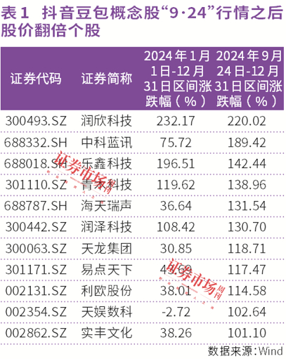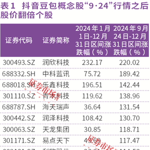 从抖音豆包概念股表现来看,76只概念股在“9·24”行情之后截至2024年底期间,除了ST凯文以下跌5.73%收官外,其他个股全部收涨,其中有11只个股实现股价翻倍(见表1)。