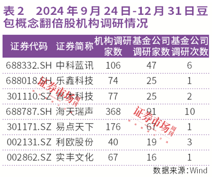从机构调研情况来看,在“9·24”行情以来的豆包概念翻倍股中,有7家公司获得机构密集调研(见表2)。