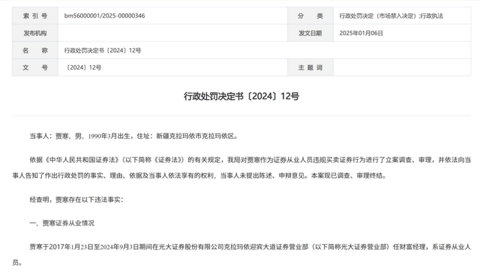 1月6日,新疆证监局披露证券从业人员违规炒股处罚书。具体来看,贾寒于2017年1月23日至2024年9月3日期间在光大证券克拉玛依迎宾大道证券营业部任财富经理期间,控制使用“叶某婧”和“田某”光大证券账户进行证券交易,下单使用设备为贾寒手机,证券交易资金主要来源于证券账户内滚存收益,资金去向主要为贾寒个人银行账户。上述期间,“叶某婧”和“田某”累计买入金额454.56万元,累计卖出金额446.32万元,账面亏损6199.94元。