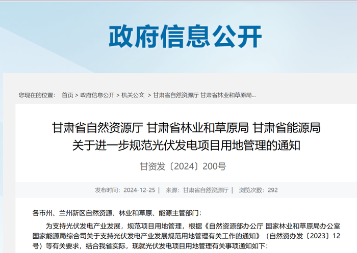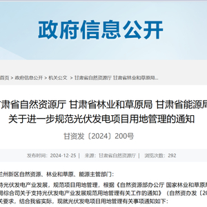 12月25日,甘肃省自然资源厅、甘肃省林业和草原局、甘肃省能源局联合发布《关于进一步规范光伏发电项目用地管理的通知》,对甘肃省光伏用地条件予以明确。