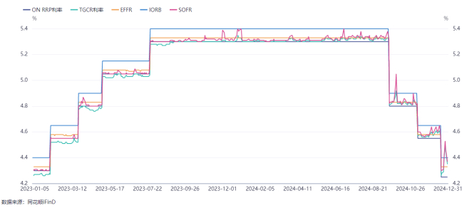 结合2023年9月开始ON RRP与TGCR利差由正转负的分析之外, 我们发现2024年开始SOFR多次触及政策利率上限IORB, 2024年下半年开始TGCR稳定在EFFR上方,种种变化暗示在岸美元资金面波动加剧,流动性较去年收紧。