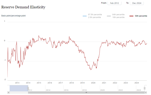 注:引自《美元流动性新指标“准备金需求弹性”简析》:RDE计算当准备金规模增加相当于银行总资产的1%时, EFFR和准备金利率(以下简称IORB)之间的利差将移动多少个基点。纽约联储将准备金储备分为充裕、充足和稀缺三种情况。当准备金充裕时,RDE 为零或接近零,反映出平坦的联邦基金需求曲线;准备金充足时,RDE 为负且较小,反映出略为负向倾斜的需求曲线;准备金稀缺时,RDE 为负且较大,反映出负向陡峭的需求曲线。