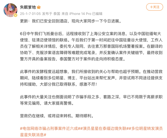 7日凌晨,其女友(网名“失眠爹地”)更新微博,同步了进展,表示6日中午飞抵曼谷后,远程接收到了上海公安立案的消息,以及中国驻缅甸大使馆、驻清迈总领馆的联络。最终收到泰国警方开具的备案报告,泰国警方对案件的走向持积极态度。