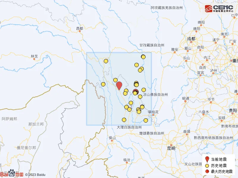 历史地震:根据中国地震台网速报目录,震中周边200公里内近5年来发生3级以上地震共47次,最大地震是2022年1月2日在云南丽江市宁蒗县发生的5.5级地震(距离本次震中106公里),历史地震分布如图。